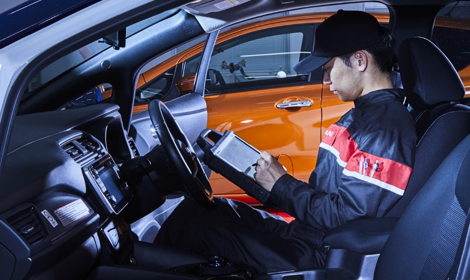 EV、e-POWER車、プロパイロット搭載車、エマージェンシーブレーキ搭載車など、数々の先進技術とそれらを搭載したクルマのメンテナンスには、高度な専門性と高い整備技術が必要となります。日産では、日々進化するクルマを整備するために、様々な教育・研修を実施。日産独自の診断機でお客さまのおクルマの故障箇所を診断し、調整・修理を独自の技術で行います。