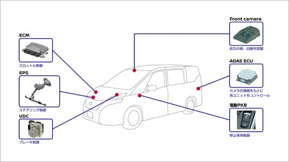 先進の画像処理ソフトウェアを搭載した単眼カメラにより、前方車両や白線を瞬時に三次元的に把握し、その情報をもとにアクセル、ブレーキ、ステアリングを正確に制御して、人間が運転している感覚に近い自然な走行を実現します。