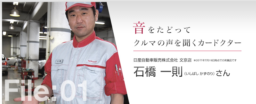 マットについていた砂をみて、「最近、海に遠出をされたのだろうか」と、持ち主のドライブシーンを思う。タイヤの減り方をみて「優しく運転をされる方だ」と、そんな持ち主に出会えたクルマを幸せにおもう。クルマの中でかすかにきこえる異音。石橋さんが聞くのは、お客さまの大事な部屋の音である。
