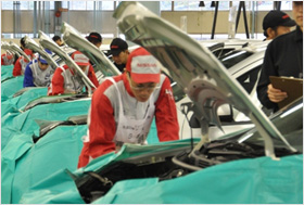 『全国日産サービス技術大会』は、全国の販売会社の中でも、地区予選を勝ち進み、選抜されたサービススタッフが日ごろの成果を競い合う大会