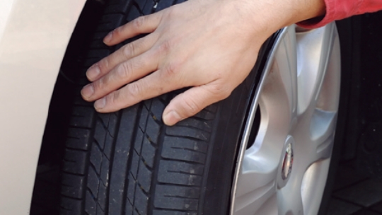 タイヤの接地部の状態を見て、極端にたわんでいないか確認します。
