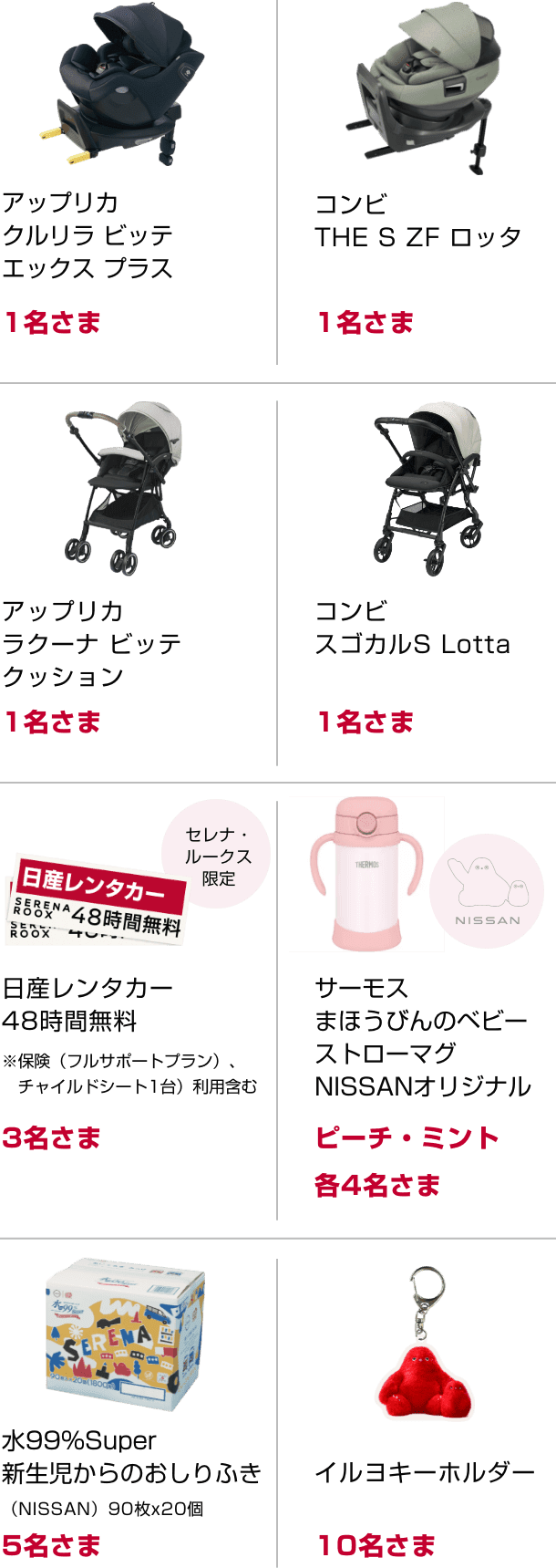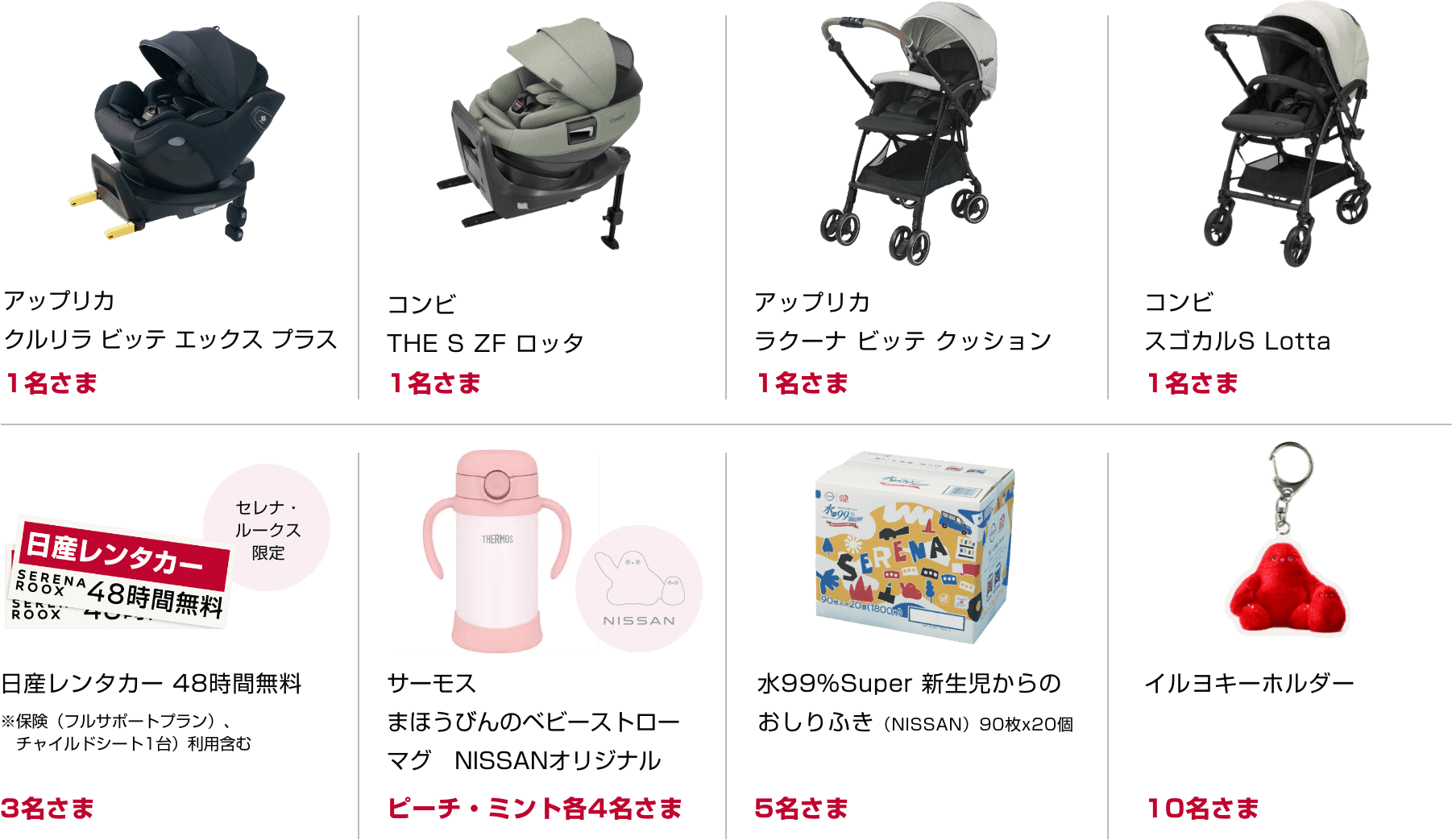 抽選で30名さまにチャイルドシートやベビーカーなど、ママパパを応援するグッズをプレゼント。 ぜひご応募ください。