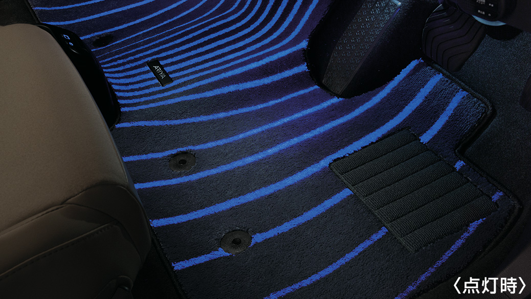 足もとのARIYAのロゴが浮かび上がり、乗車時に高揚感をもたらします。