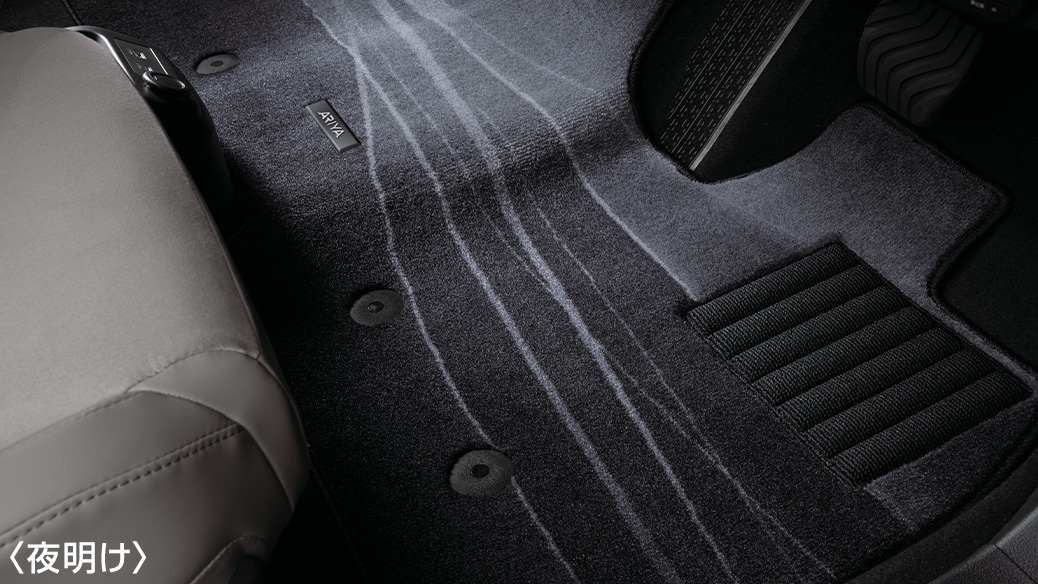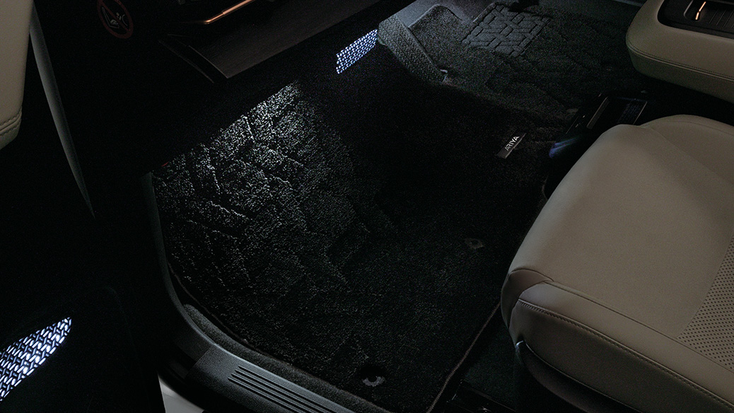 前席と後席の足もとを白色の光で照らし出し、車内を大人の空間に演出します。