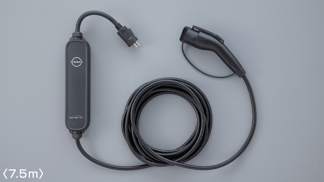 注1)充電ケーブルは、100V用、200V用ともEV・PHEV充電用屋外コンセントにのみ対応し、専用配線を用いた電源回路が必要になります。メーカーオプション設定の充電ケーブル 200V 7.5mの長さ違い、または対応電圧違いです。100Vでは充電時間が長くかかりますので、200Vでの充電をおすすめいたします。