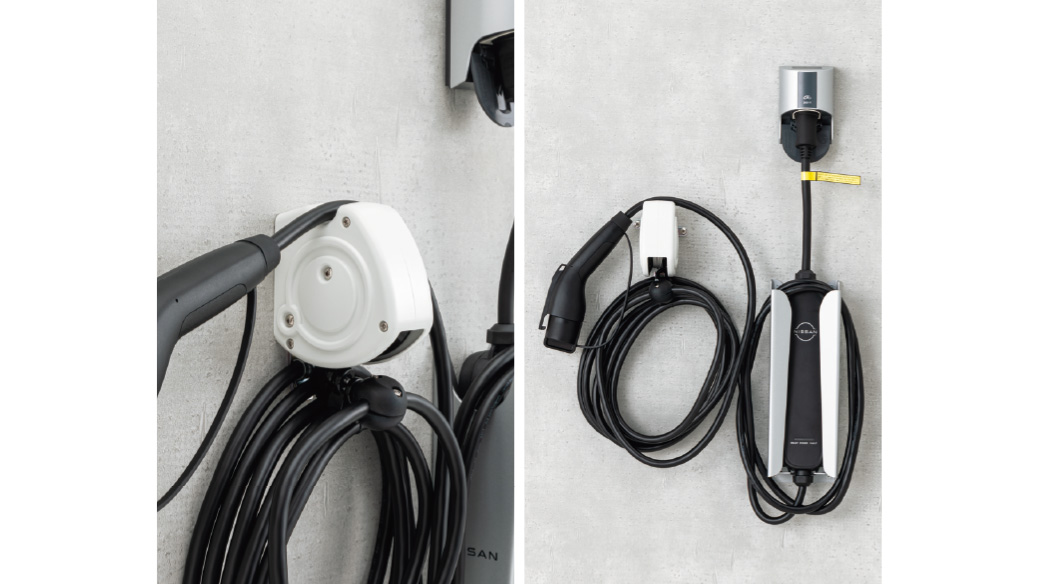外壁等に充電ケーブルホルダーとセットで取り付けが可能です。伸縮できるリール付のワイヤーで必要な長さだけ引き出すことができ、ケーブルが地面につく心配もありません。また、自動巻き取り式なので、ほどいたり巻いたりすることなく、充電がスムースに行えます。