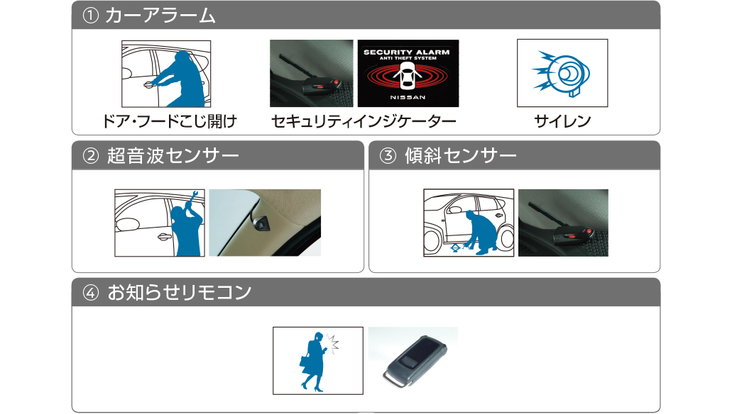 ①カーアラーム ②超音波センサー ③傾斜センサー ④お知らせリモコン