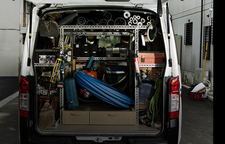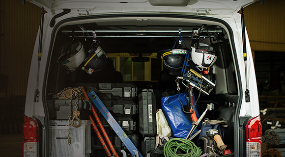 ケーブル類は縛ってまとめ、大きくかさばる工具や機械は中央へ。天井の純正穴に備え付けられた手作りラックのおかげで、走行中にバラバラになることもない。 現場の仲間同士で道具の位置を共有することで、飛躍的に作業効率が高まったという。