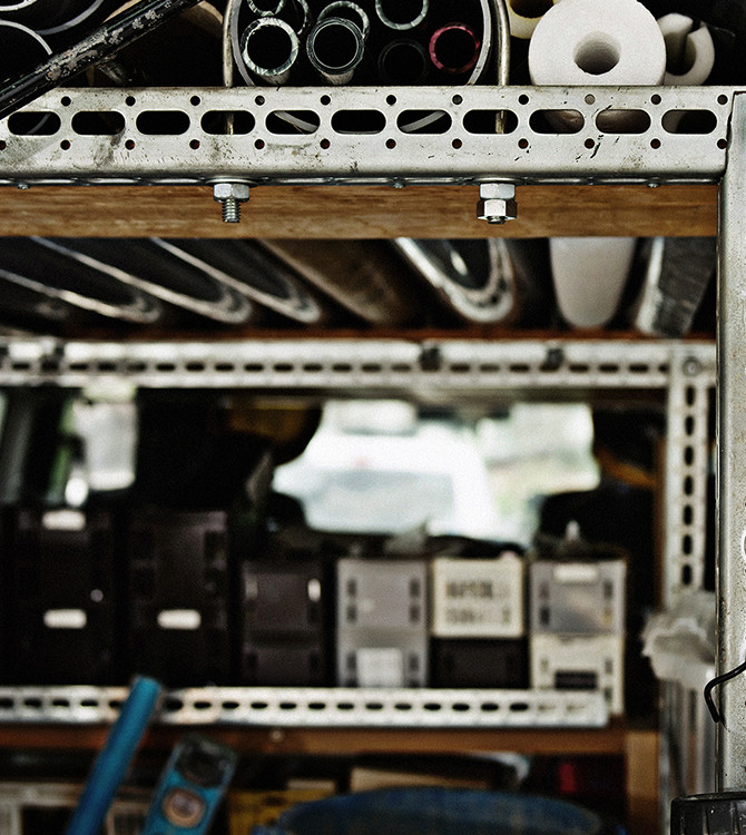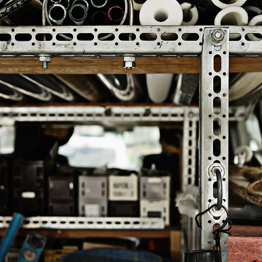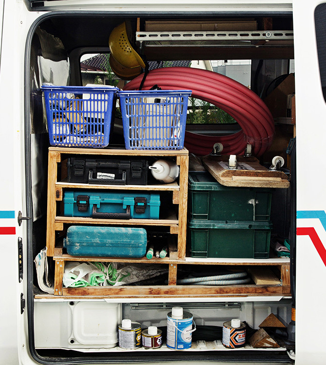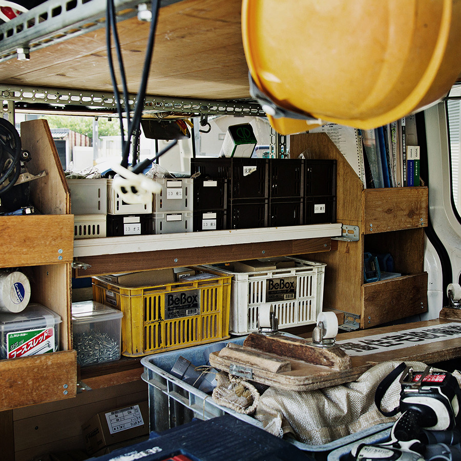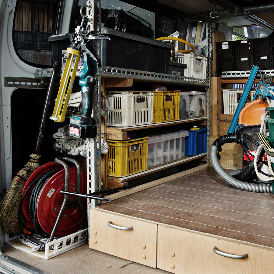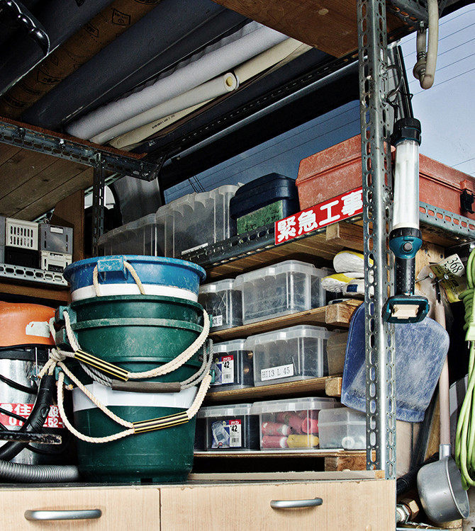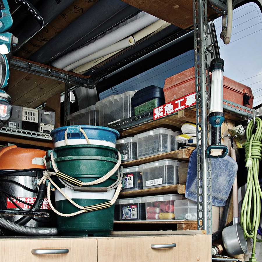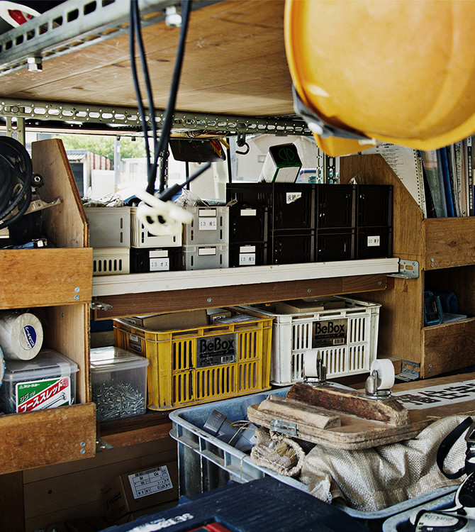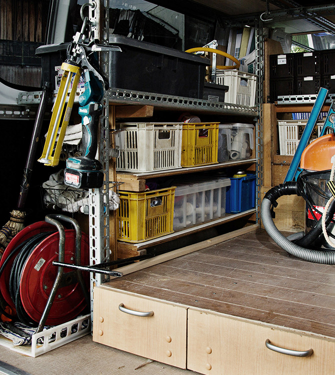 ケーブル類は縛ってまとめ、大きくかさばる工具や機械は中央へ。天井の純正穴に備え付けられた手作りラックのおかげで、走行中にバラバラになることもない。 現場の仲間同士で道具の位置を共有することで、飛躍的に作業効率が高まったという。
