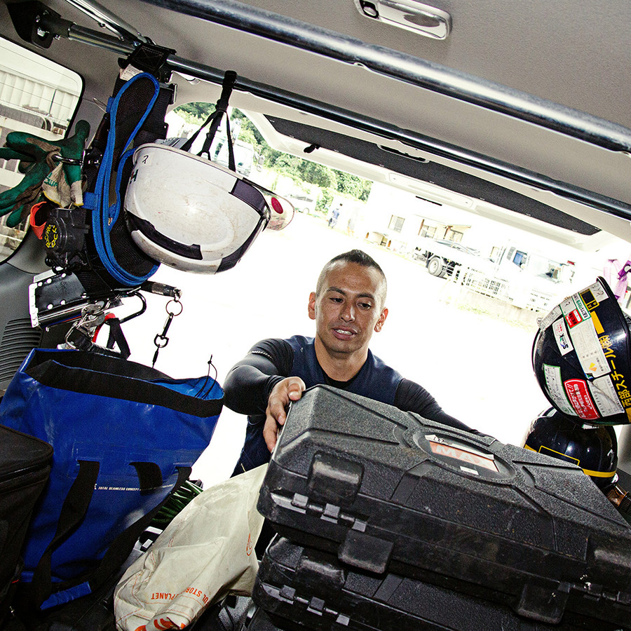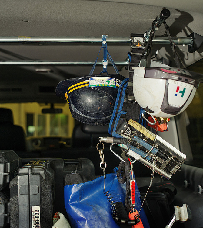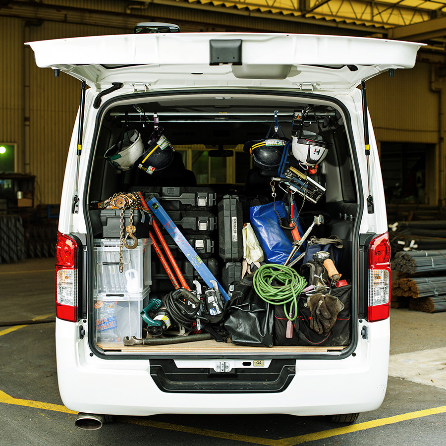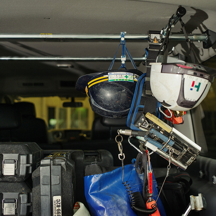 大きな改造を施さず、元々の広々とした荷室の空間に、職人全員分の電動工具を立体的に積み込む。上部にポールを設置することで、被り終えたヘルメットや手袋など、通気性が求められる道具をぶら下げておけるようになっている。