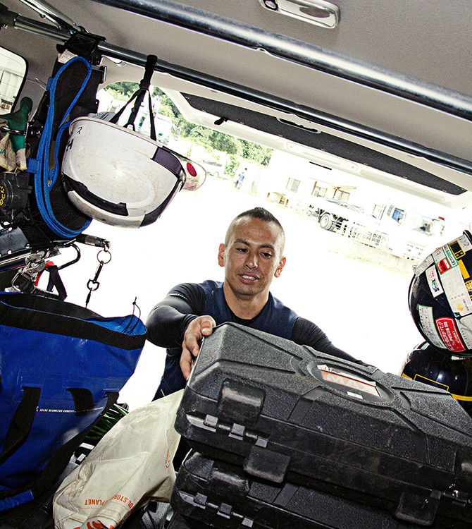 「後ろは本当に快適。座り心地の良いシートなので、昼休み休憩も車内で落ち着ける。愛妻弁当を持ってきて、車で食べることもあります。現場ではキャラバンが、そのまま憩いの空間になっていますね」