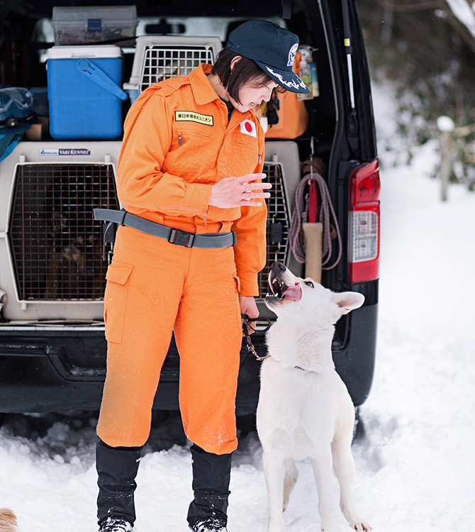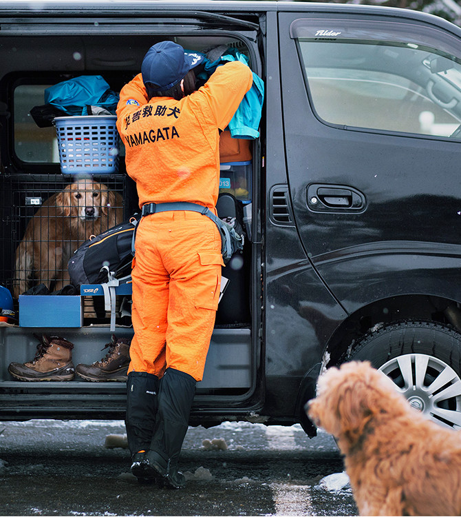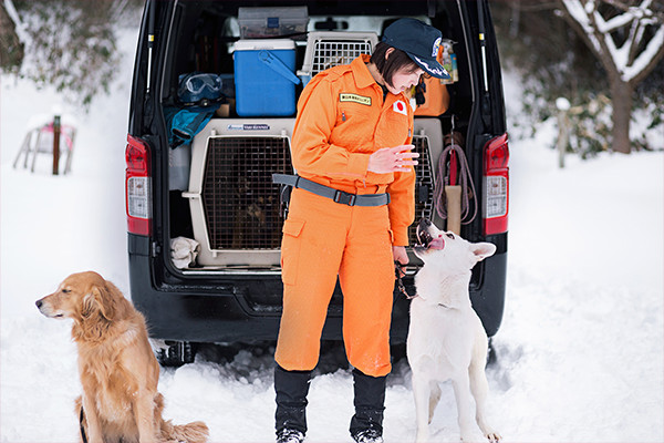 実際の救助現場では、さらに過酷さを増す。遭難者を探して何時間も山中を歩き回るだけでなく、車中泊を行うこともある。荷物も、人も、犬も、すべて一台の車の中で過ごす。当然ながら、暖房をつけたまま眠ることはできない。誰もいない雪山で、寝袋一つで救助犬と共に出動までの数日を滞在しなくてはならない。