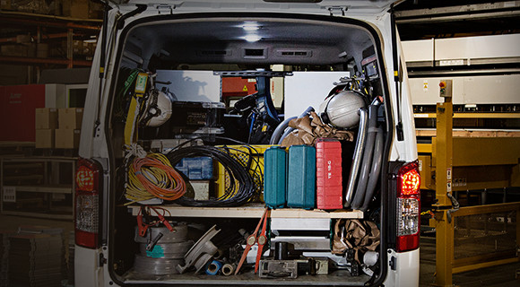 大型犬用のケージを後部座席と荷室にそれぞれ配し、訓練用の手綱やヘルメットをかける多用途のポールを中央に。汚れやすい床にはビニール製のマットを敷き詰めることで衛生面を向上させている。