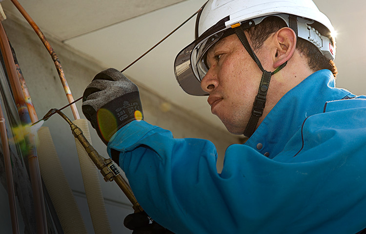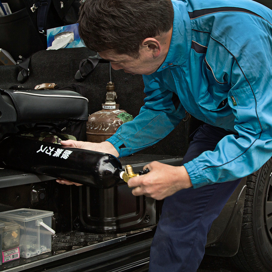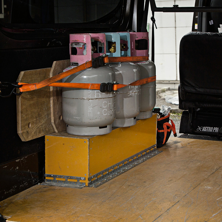 「エアコンの充填用ガスボンベを載せる台座を自作し、サイドのナットと併用して固定しています。運転中に倒れる心配をしなくても良いので、安心感が生まれました」