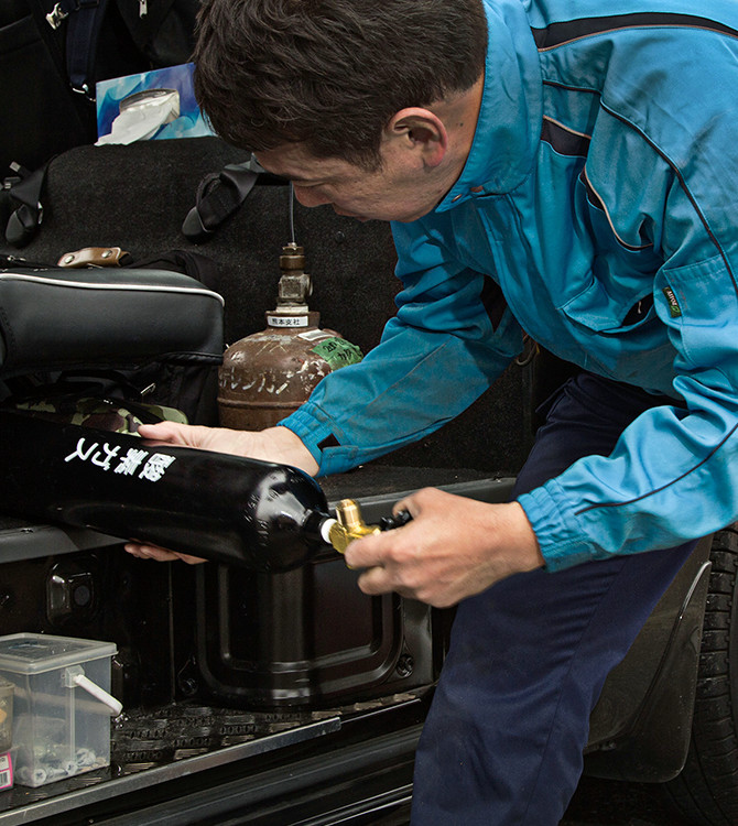理想の走行を求めタイヤをチューンナップし、運転席周りもカスタム。仕事のサポートだけでなく、震災時の車中泊にも対応する居心地を追求した。