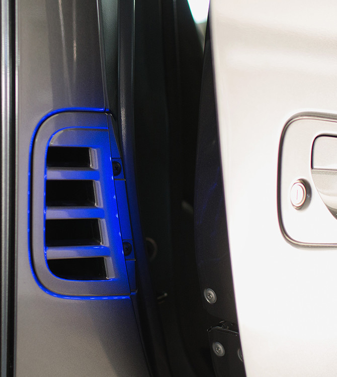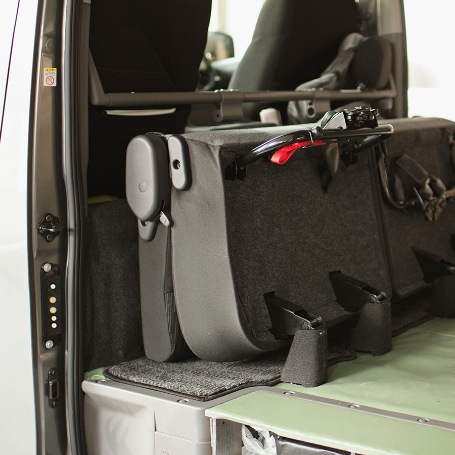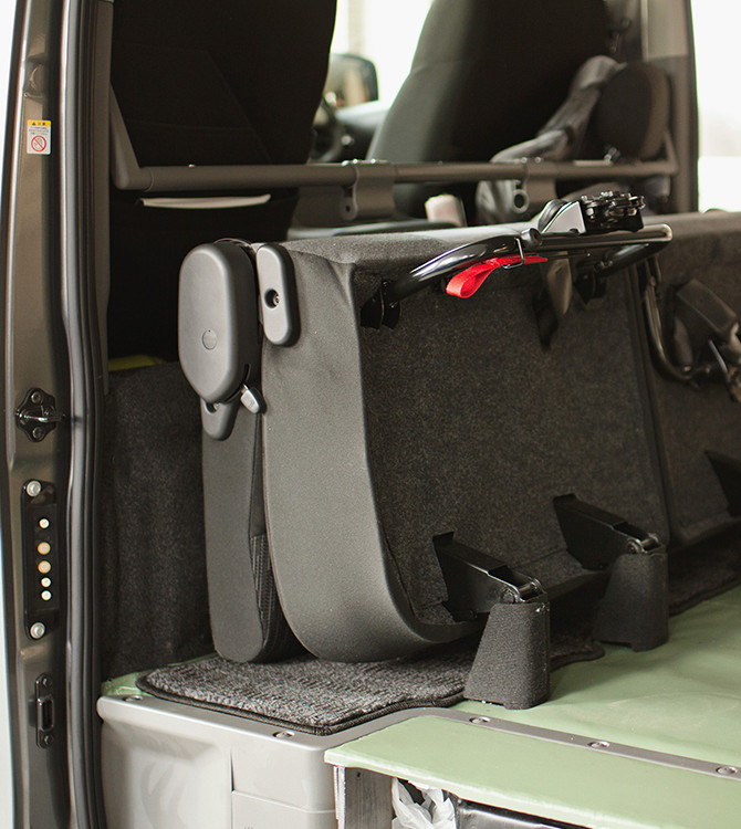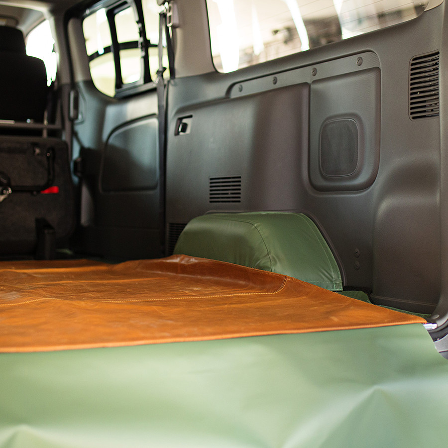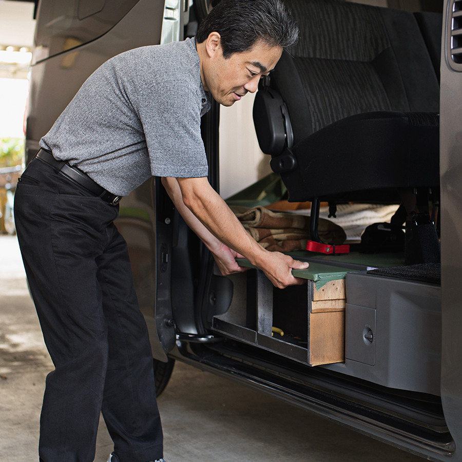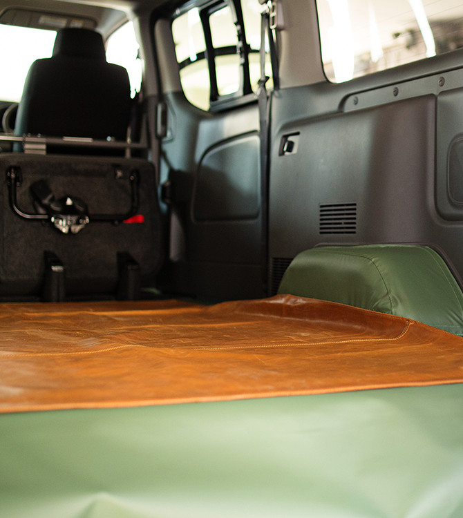 「荷室に椅子を入れる際に、椅子も車も傷つけないように、ビニールレザーと本革を床面に敷くカスタムをしています。滑るようになっているので、少ない力で椅子を奥まで入れることができます」