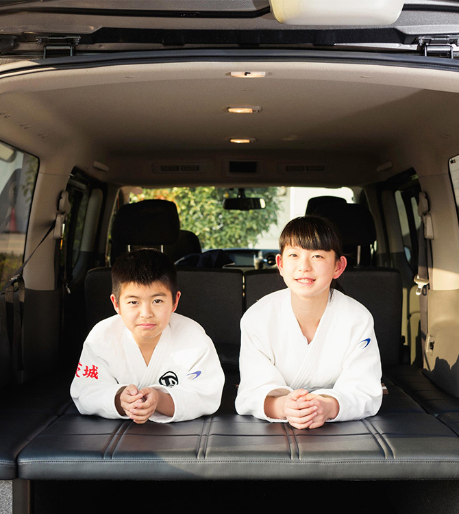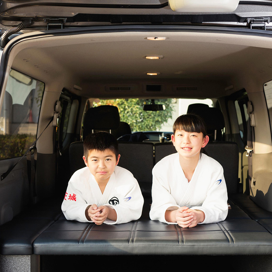 「プライベートで長年、柔道を教えているので、教え子でもある娘・息子の送迎でもキャラバンを使っています。その際には、荷室をフラットにカスタマイズして休憩も。家族の安らぎの時間です」