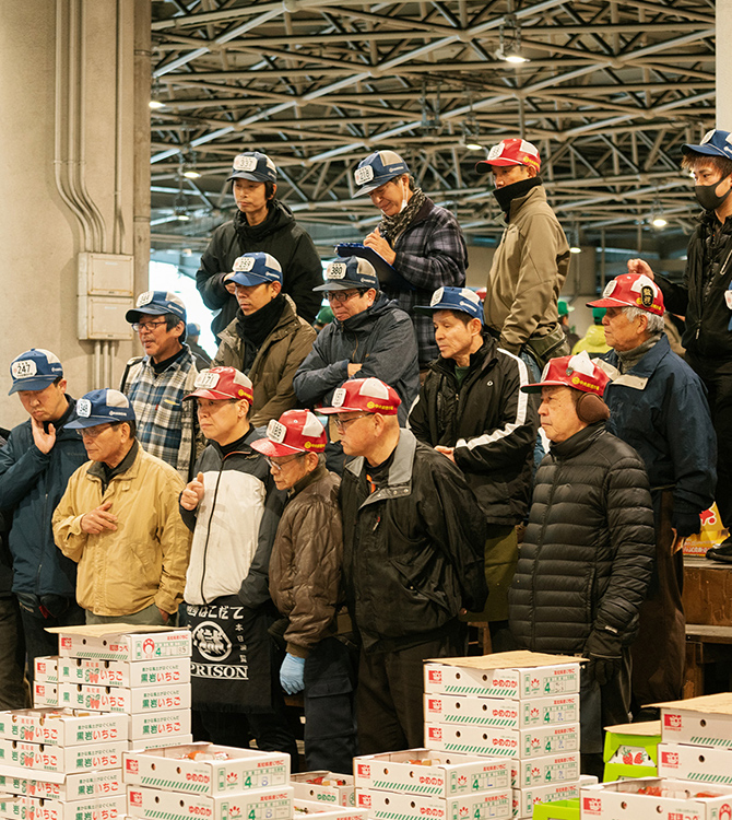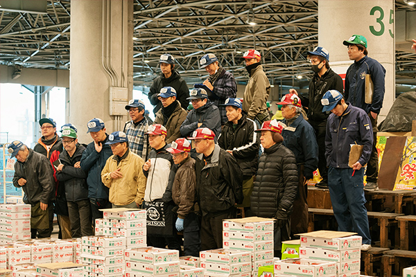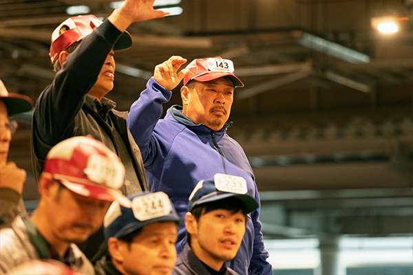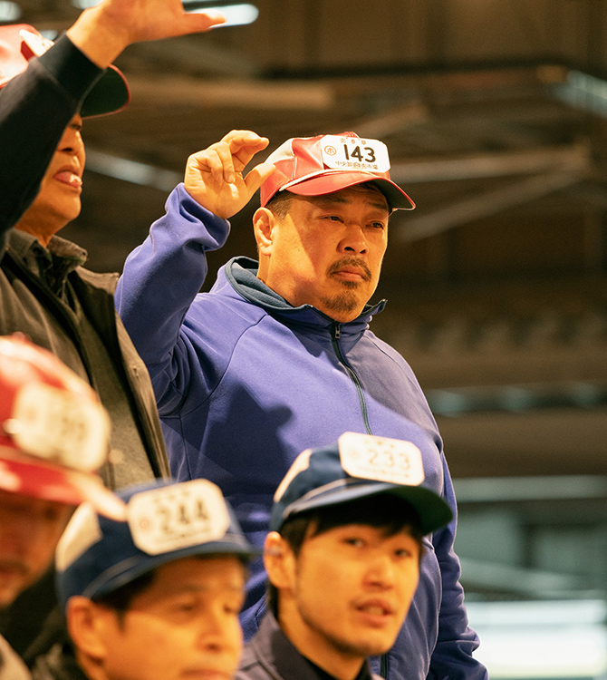 壇上に並んだ参加業者たちが、数字を表す市場共通のハンドサインを駆使し、一斉に入札を始める。競り人はそれらを瞬時に見極め、「謡い」と呼ばれるかけ声とともに、最も高額な値づけをした落札者の番号を叫ぶ。