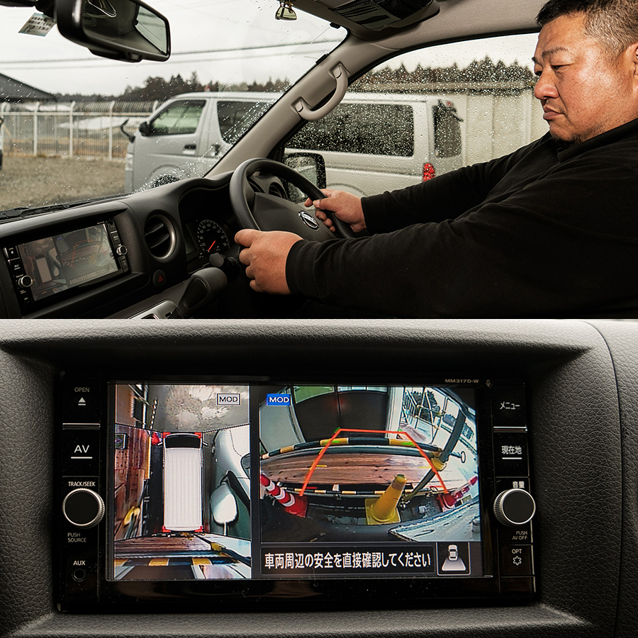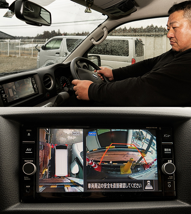 「工事現場の駐車場は、様々な資材があって狭いところも多い。現場近くの宿舎で長期滞在することも多いし、慣れない場所で車庫入れすることも度々。それでもこれで後ろが見られるおかげで、いつも車庫入れはスムーズにできているよ」