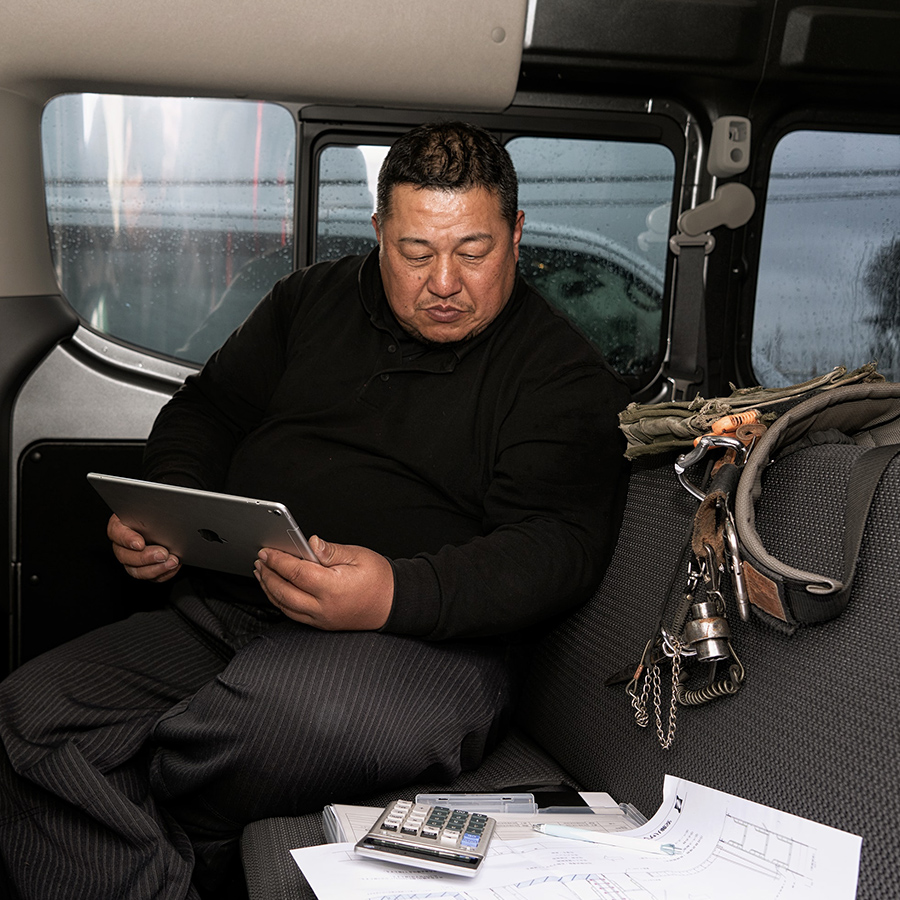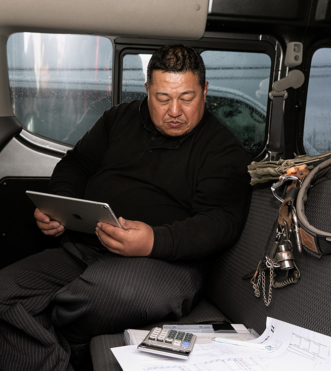 「ひとつの現場で働きながら、並行して別の現場の書類を作らなければいけないことも。そんな時は、現場を従業員に任せ、乗ってきたキャラバンで作業することもある。キャラバンの中でひとり静かに過ごす時間は、すべての仕事のベースなんだ。ゆっくりと落ち着けるから、まるで“社長室”の気分でくつろいでるよ」