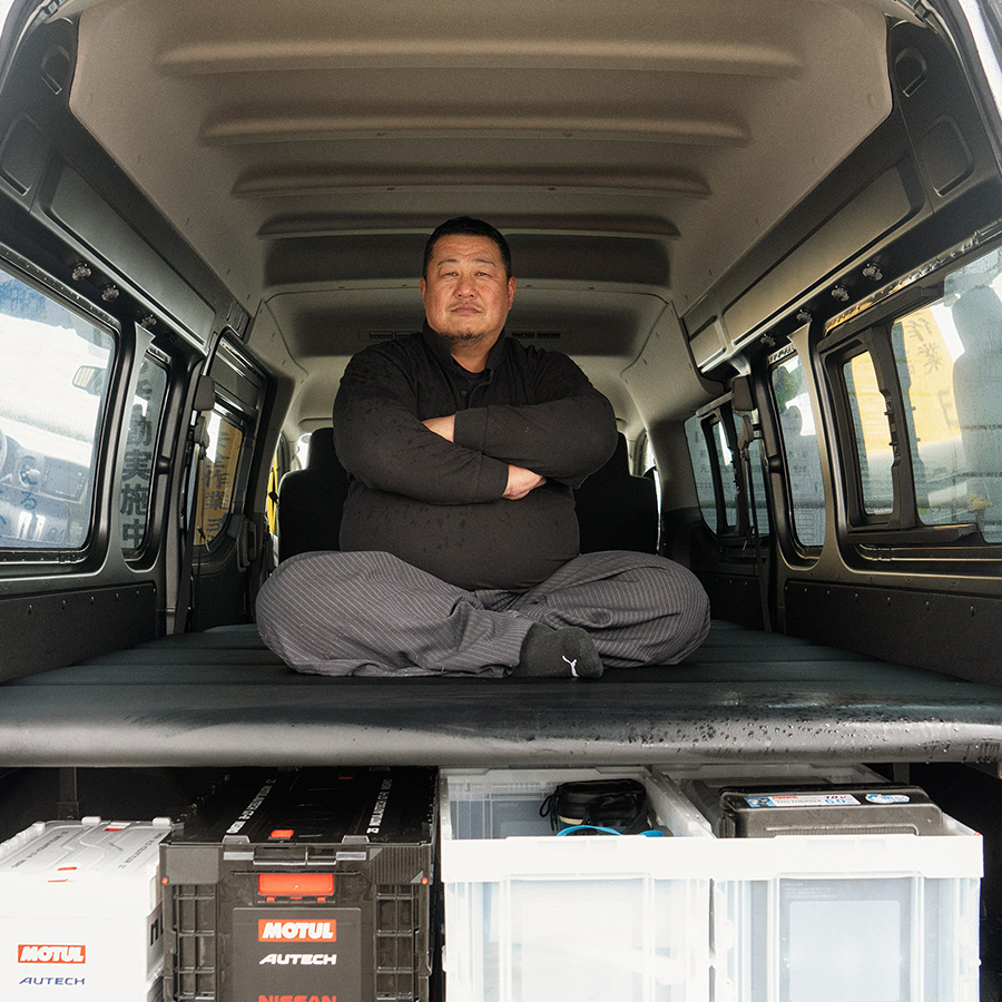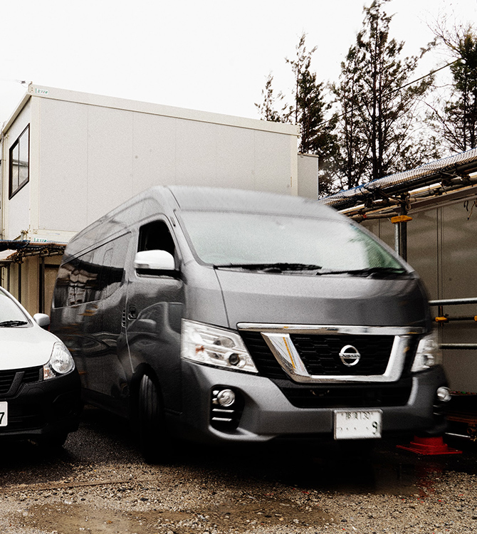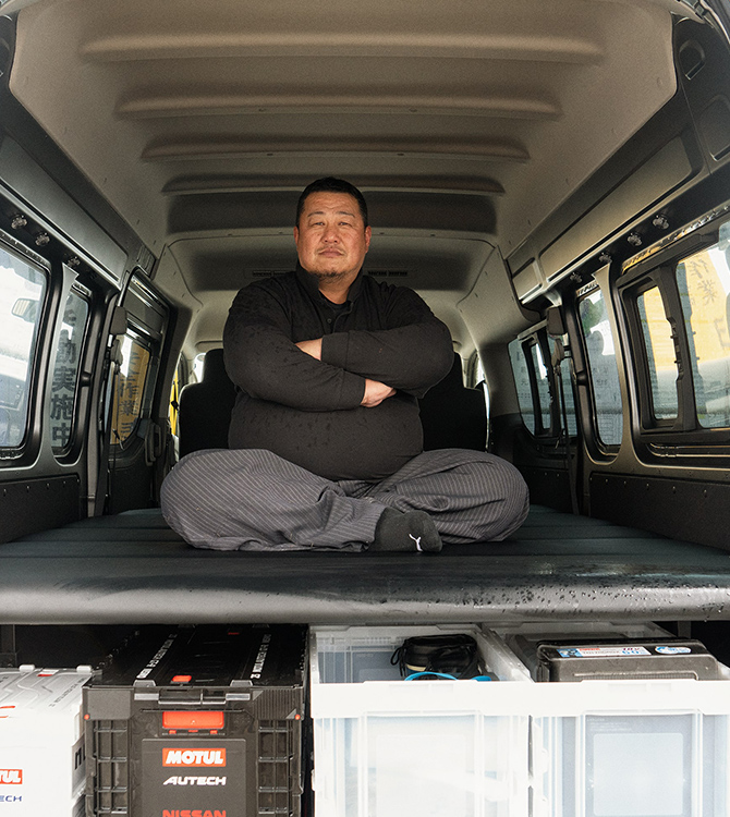 「買うなら広ければ広いほどよかった」という池永が選んだ車体は、GXのワイド幅 ハイルーフ。荷台に荷物を積み込んだり、職人仲間を乗せたり、ベッドキットを使って仮眠を取ったりと、余すことなくその広さを活用している。