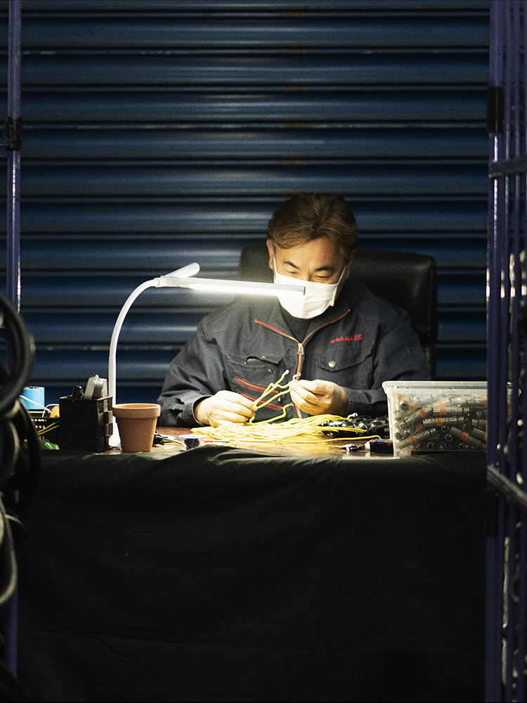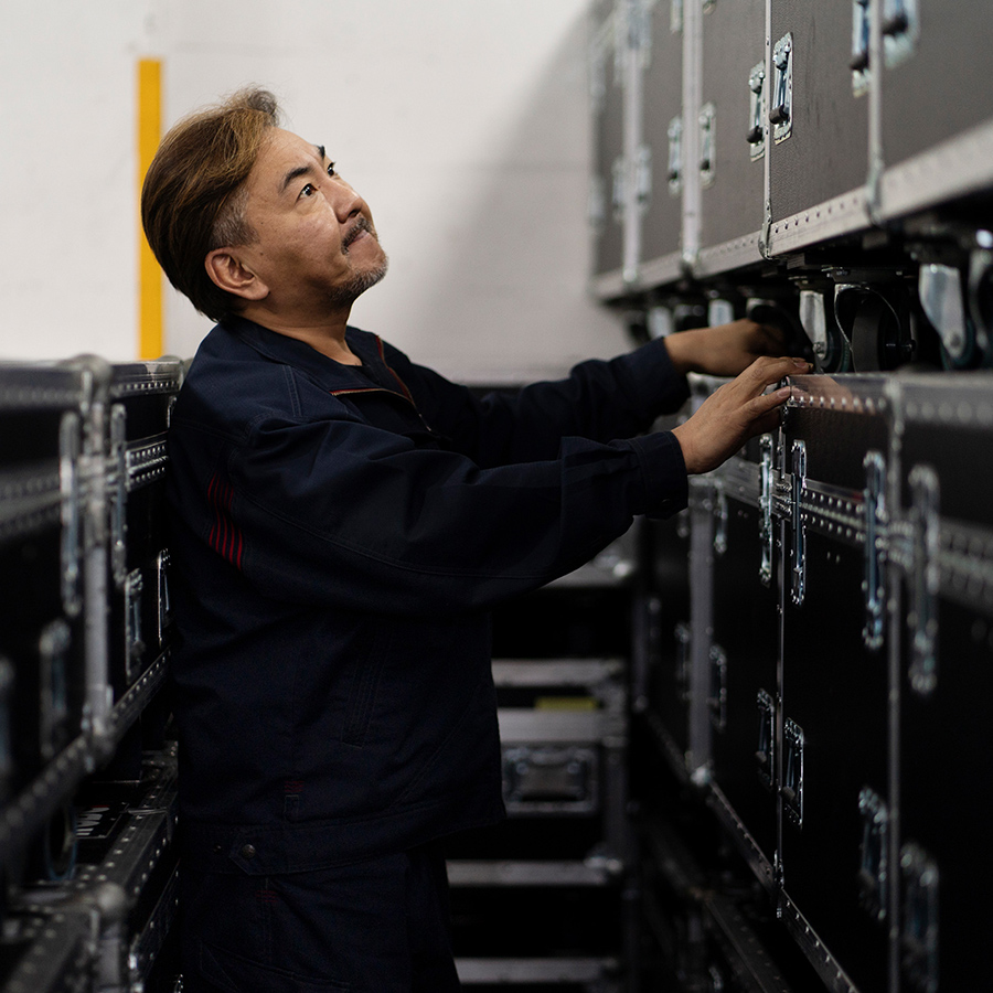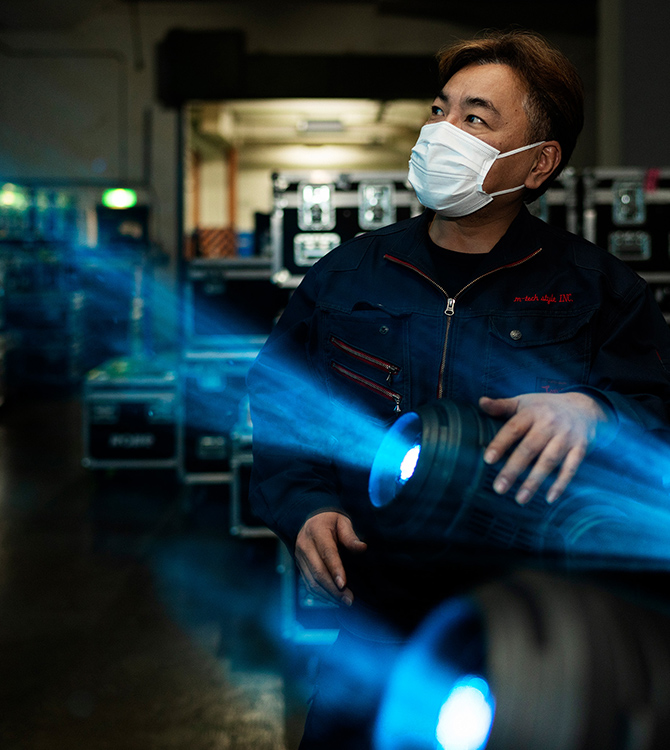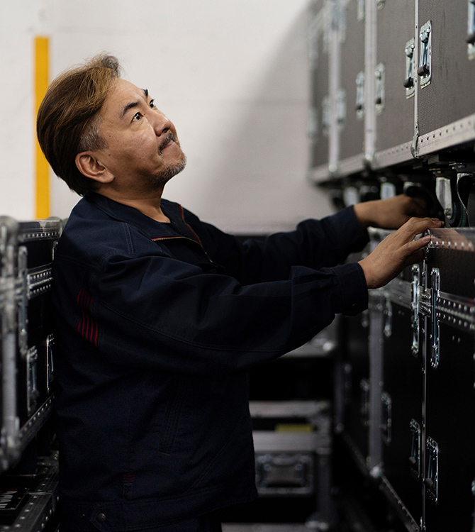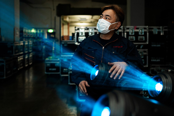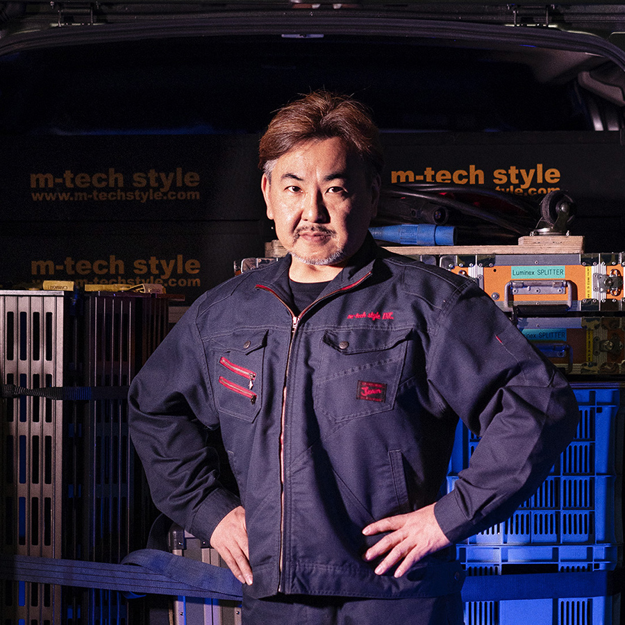 スポットライト一つない地方の小さな商店街から、アリーナクラスの大規模公演まで、必要とあらば自らキャラバンを運転し、現場に最適な機材を届けてきた。才能やセンスにあふれる若い世代には、実践を通じて成長できる《現場》を創る。自ら不向きな領域があれば、信頼できる仲間たちに委ねる。