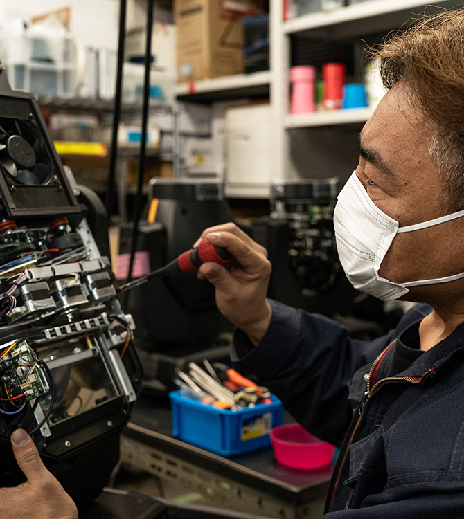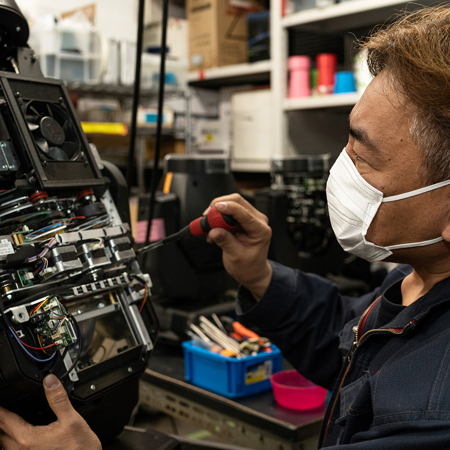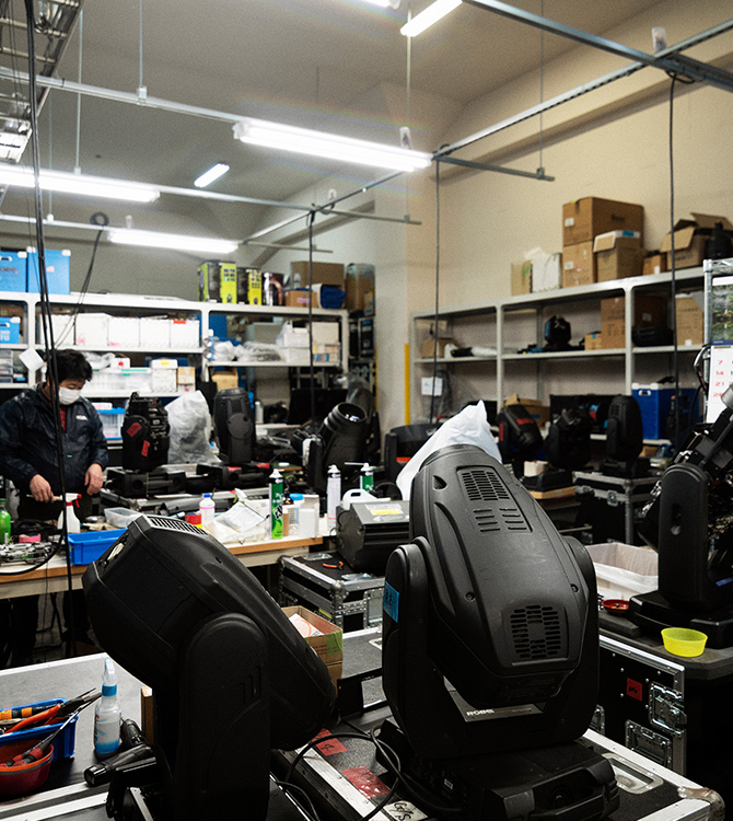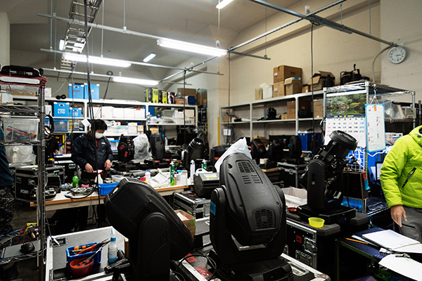 得意としていたのは、経験と勘がものをいうメカニカルな領域だ。膨大な量の機材を整備し、現場のトラブルを未然に防ぎながら、まだ国内で出回っていないような珍しい設備や、ヨーロッパの最新の照明機器メーカーと交渉し、新しい表現の可能性を率先して取り入れてきた。