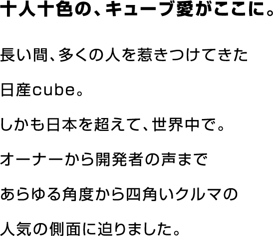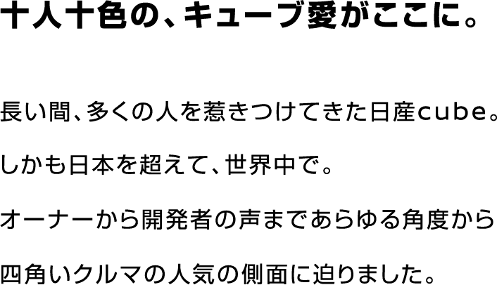 十人十色の、キューブ愛がここに。長い間、多くの人を惹きつけてきたきた日産cube。しかも日本を超えて、世界中で。オーナーから開発者の声まであらゆる角度から四角いクルマの人気の側面に迫りました。 十人十色の、キューブ愛がここに。長い間、多くの人を惹きつけてきたきた日産cube。しかも日本を超えて、世界中で。オーナーから開発者の声まであらゆる角度から四角いクルマの人気の側面に迫りました。