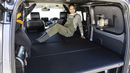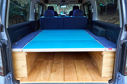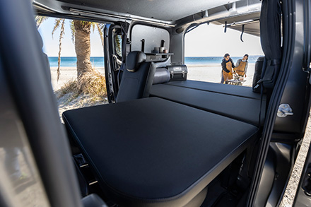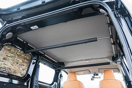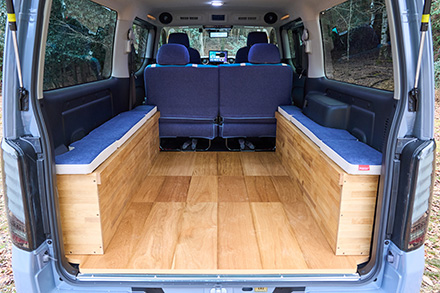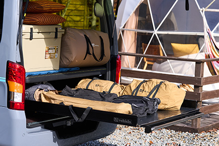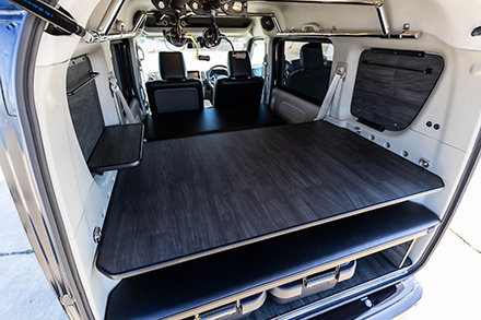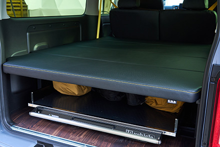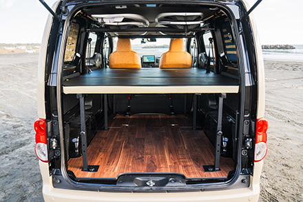 トランポビルダーとして老舗のオグショーだが、そんな同社がミドルサイズのNV200バネット車中泊仕様を手がけた最新作。ベッドキットなどにはこだわりのコーデュラ生地採用が特徴で、アウトドアシーンにはもちろん、街乗りでも違和感を感じない仕上がりだ。ポイントは、ほぼすべてのアイテムが通販用パーツで構成させていて、誰でも簡単にDIYメイクできるということ。
