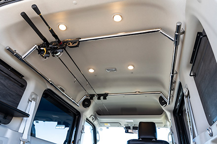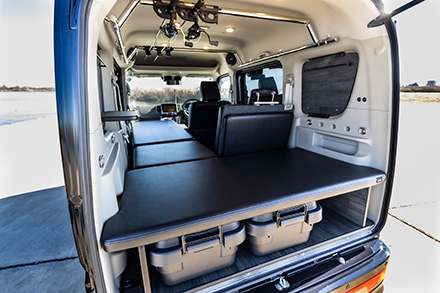 キャラバン、NV200バネット、クリッパーと日産商用車をベースに機能的なコンプリートカー製作を手がけるニーズ札幌。今回のクリッパーは、バンではなく、ワゴン車両である”リオ”をあえて選び多彩なベッドレイアウトで釣りを満喫するための車中泊装備を詰め込んでいる。