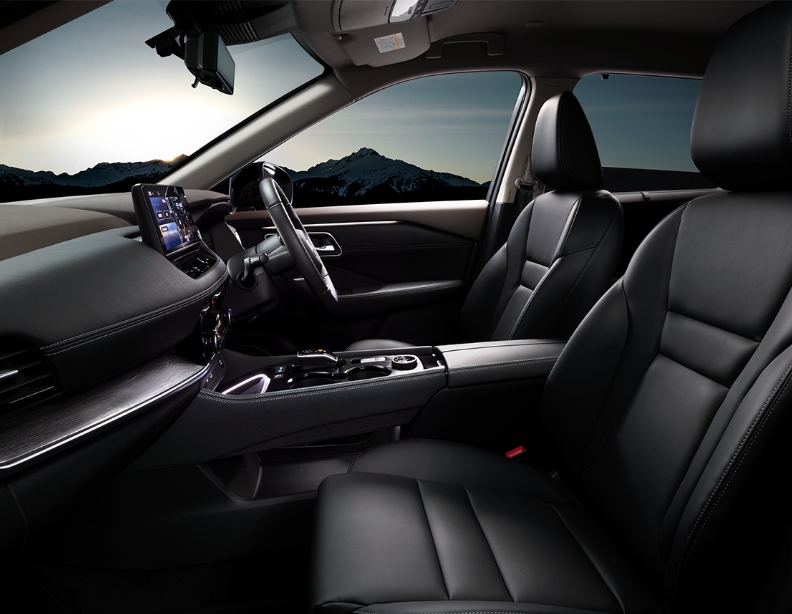 インテリアデザインにおいてのタフさとは、水平基調で骨太な骨格のインストルメントパネルから感じていただけることでしょう。 外へ向かっていく広がりによる開放感と、ステッチを施したソフトパッドの合皮のラッピングに包まれ、安心してドライビングを楽しめる空間になっています。