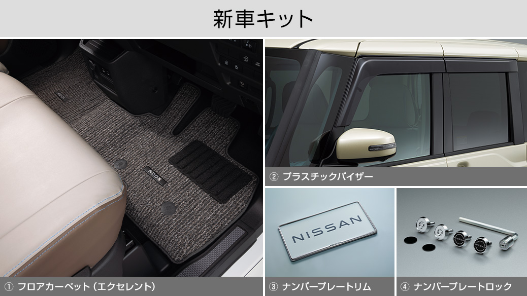 ■新車キット:【セット内容】 ①フロアカーペット (エクセレント)(標準地車用/寒冷地車用) ②プラスチックバイザー ③ナンバープレートリム (ダーククローム:1台分) ④ナンバープレートロック(Nissanブランドロゴステッカー付)