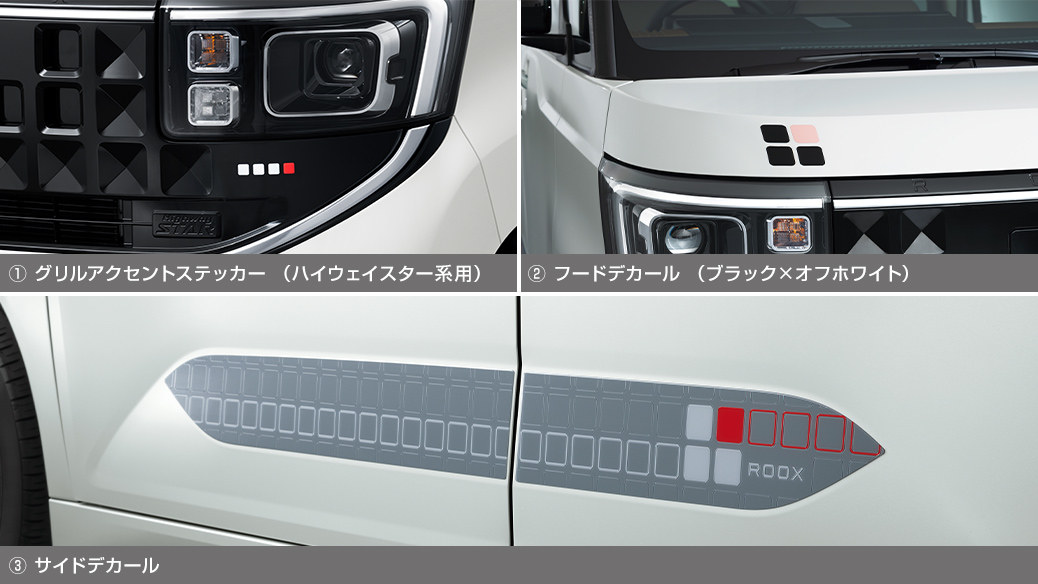 ■【セット内容】①グリルアクセントステッカー+②フードデカール(ブラック×オフホワイト)+③サイドデカール