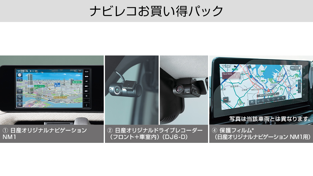 ■ナビレコお買い得パック:【セット内容】①日産オリジナルナビゲーション NM1+②日産オリジナルドライブレコーダー(DJ6-D)+④保護フィルム*(日産オリジナルナビゲーション NM1用)