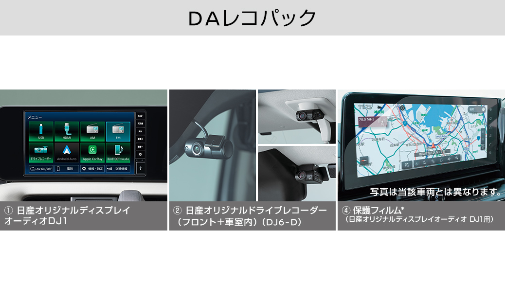 ■DAレコパック:【セット内容】①日産オリジナルディスプレイオーディオ DJ1+②日産オリジナルドライブレコーダー(DJ6-D)+④保護フィルム*(日産オリジナルディスプレイオーディオ DJ1用)