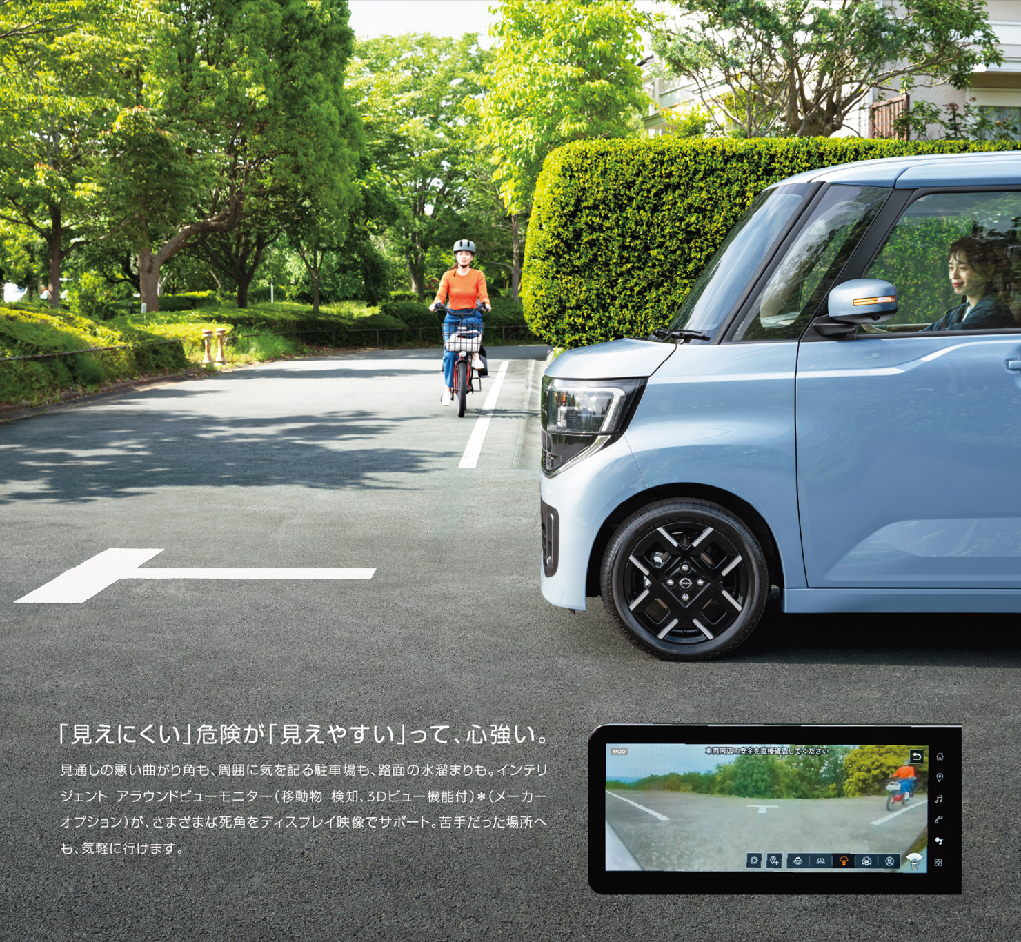 ◼︎モニターにて確認できる範囲には限界があり、カメラ位置より⾼い物体は表⺬されません。必ず⾞両周辺の安全をミラーや⽬視で直接確認してください。