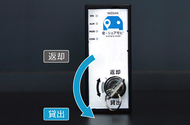 助手席のグローブボックス内にある「貸出キーボックス」の貸出キーを、「返却」から「貸出」方向へ回し、キーを引き抜いてください。