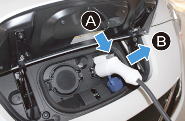 (A)充電コネクタのリリーススイッチを押して解除しながら、(B)充電ポートからコネクタを引き抜いてください。