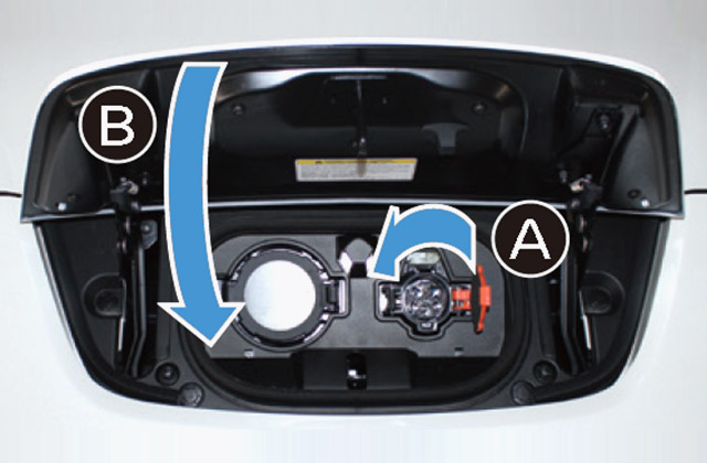 (A)充電ポートのキャップを閉じてから、(B)充電ポートリッドを確実に閉めてください。