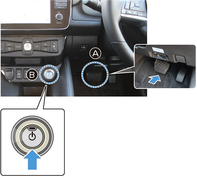運転席付近にインテリジェントキーがあれば、日産リーフを起動させることができます。(A)ブレーキペダルを踏みながら(B)パワースイッチを押すと起動します。