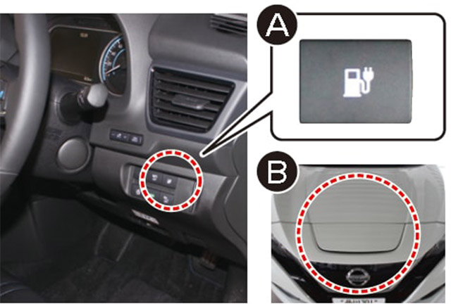 (A)充電ポートリッドオープナーを押すと、(B)充電ポートが開きます。