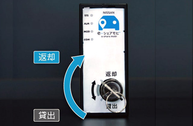 助手席のグローブボックスにある「貸出キーボックス」に貸出キーを差し込み、「貸出」から「返却」方向へ回してください。