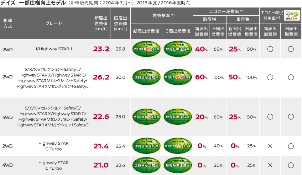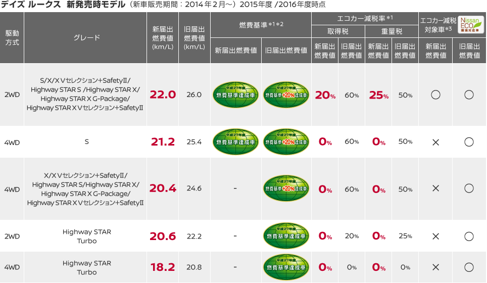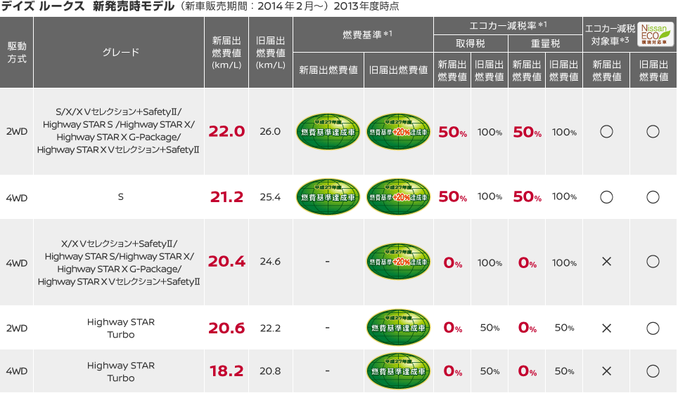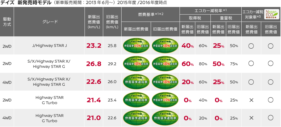 *3:2009年4月より一定以上の「排気性能」と「燃費基準」を満たしたクルマを対象としてエコカー減税が始まりました。日産はエコカー減税対象車を「Nissan ECO」(ネコ)シリーズと呼んでいます。日産デイズ・デイズ ルークスは新届出燃費値により、グレードによってエコカー減税の対象ではなくなります。