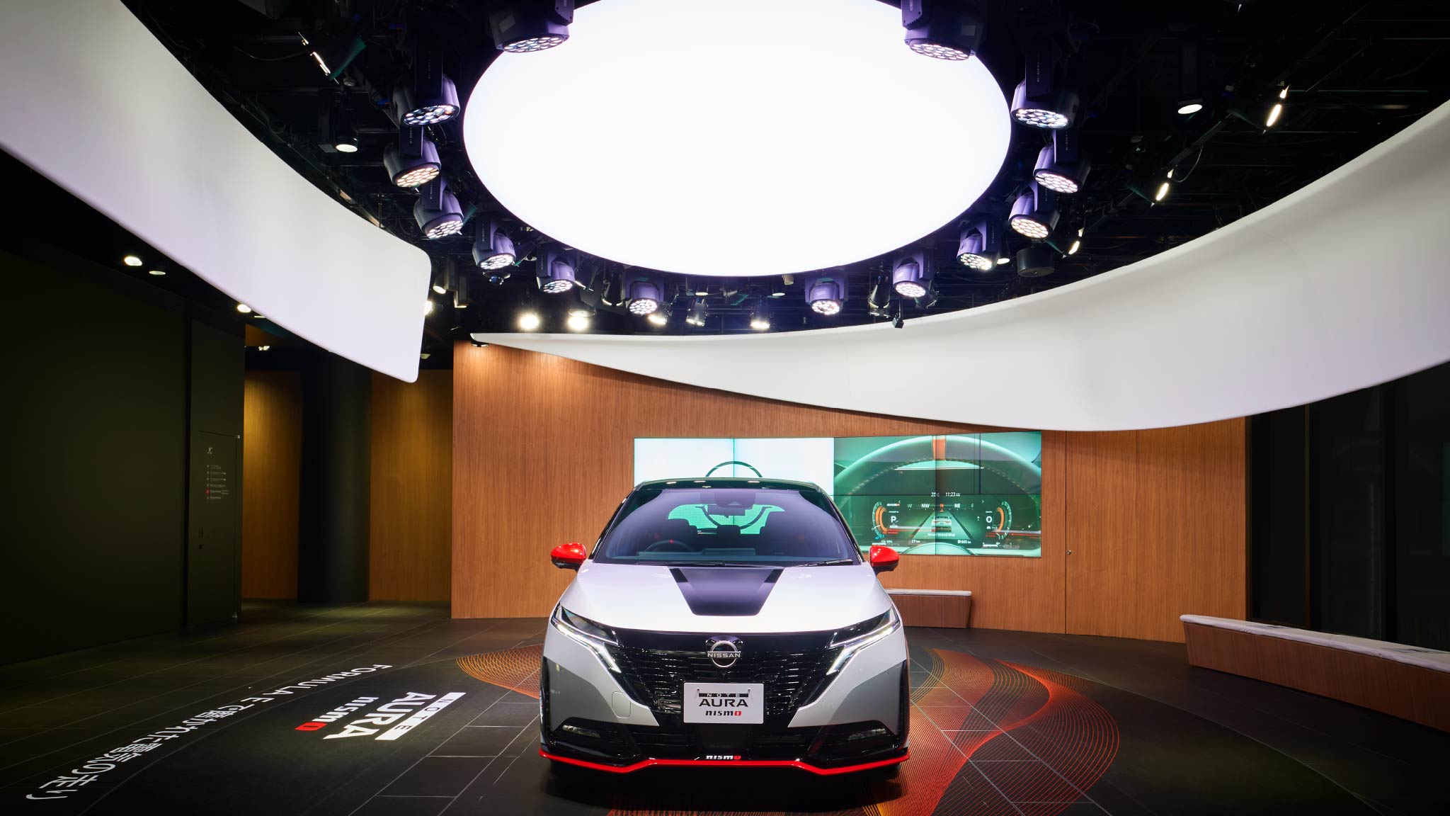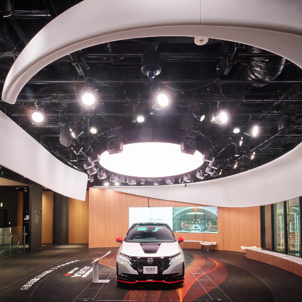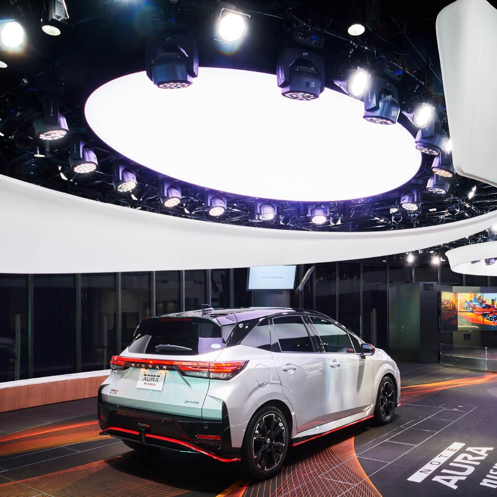 The lighting, which represents the NISSAN CROSSING 'Spiral' design theme, illuminates the vehicles attractively.