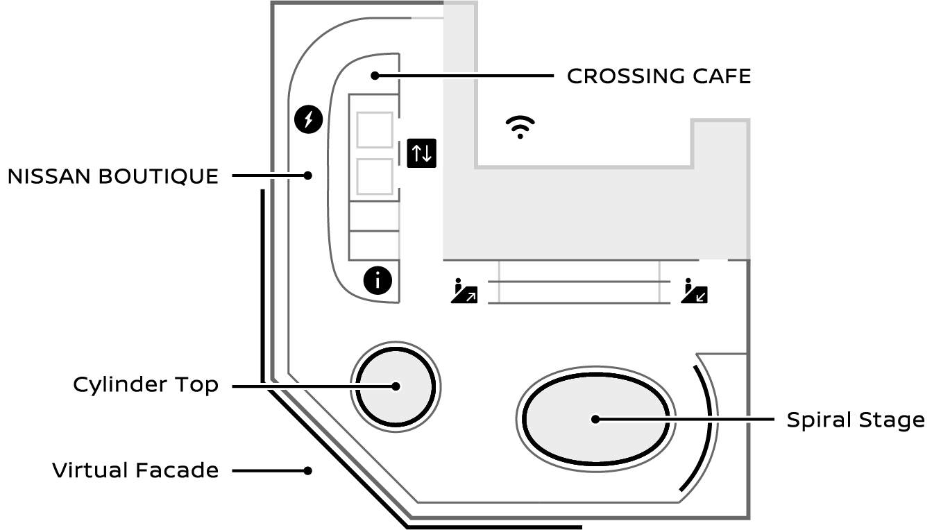 NISSAN CROSSINGは、お客さまに「ワクワクする未来のドライビング体験」をお届けします。最先端テクノロジーを搭載した未来のクルマの展示、センターステージでのプレゼンテーションや、大型タッチスクリーンでの情報発信など、クルマとヒトと社会との新しい関係を体験いただけます。