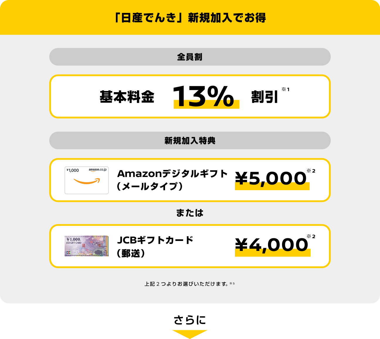 ※5 新規加入特典、ZESP加入者特典ともに同一名義による受領は1回/人を上限とします。また、過去に日産でんきをご契約いただいたお客さまは対象外となります。