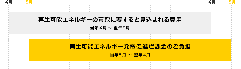 「再生可能エネルギー発電促進賦課金」とは、再生可能エネルギーの固定価格買取制度という法令に基づき、電力会社等が買取りに要した費用を、電気のご使用量に応じて、電気料金の一部として、電気をご使用になるお客さまにご負担いただくものです。当年4月分から翌年3月分の買取りに要すると見込まれる費用を同年度(当年5月分から翌年4月分)にご負担いただくこととなります。