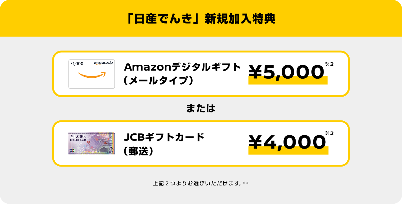 ※6 新規加入特典、ZESP加入者特典ともに同一名義による受領は1回/人を上限とします。また、過去に日産でんきをご契約いただいたお客さまは対象外となります。