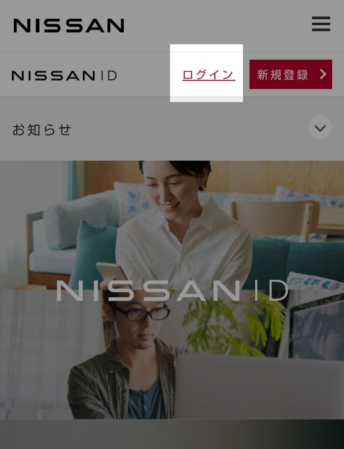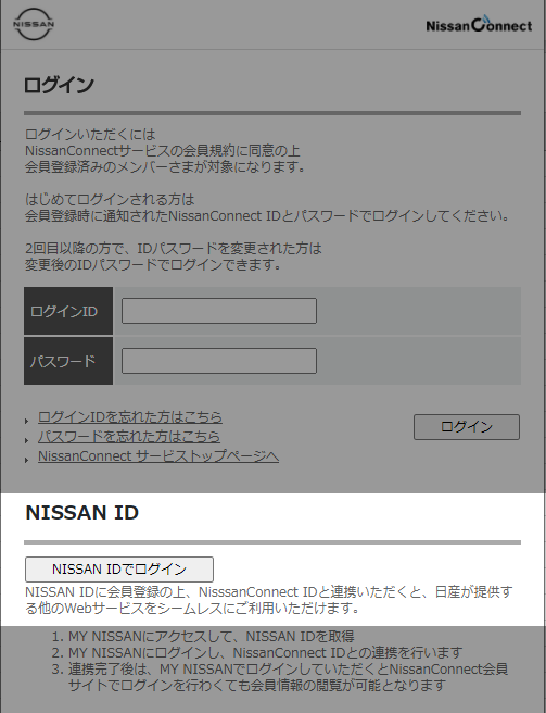 NISSAN IDトップ画面にアクセスし、ログインしてください。