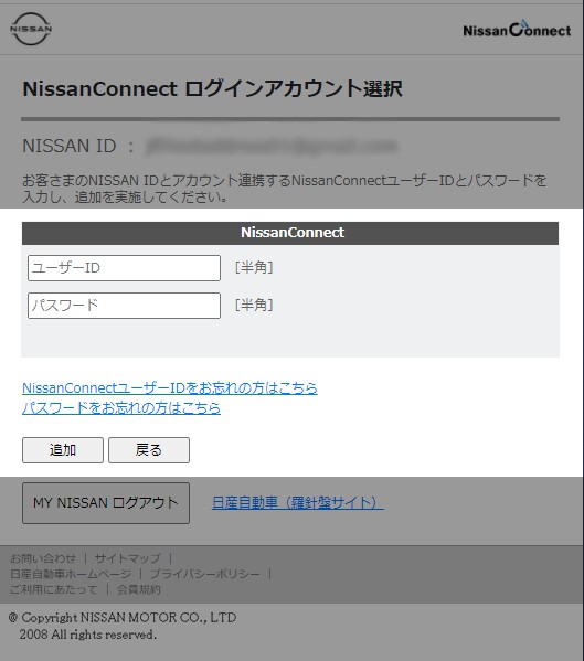 アカウント追加画面で、お持ちのNissanConnectのユーザーIDとパスワードを入力し「追加」をクリックしてください。